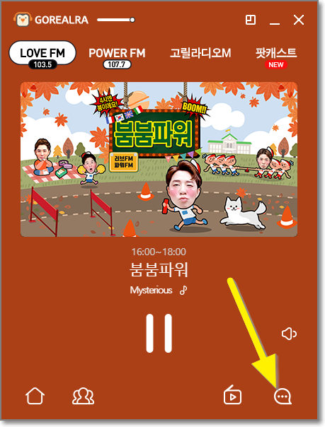 "확인"까지 누르면 SBS 고릴라 라디오 플레이어가 보입니다. 플레이어 오른쪽에 붙어있는 광고는 엑스를 누르면 쉽게 없어집니다. 현재 나오는 방송은 붐의 붐붐파워입니다. 이상태에서 오른쪽 밑에 말풍선처럼 생긴 아이콘을 눌러봅니다.