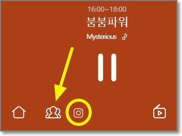 또한 사람이 여럿이 있는 아이콘을 누르면 오른쪽에 진행자의 SNS가 표시되는데요. 붐의 경우에는 인스타그램으로 연결이 됩니다.