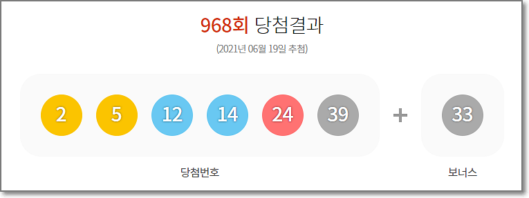 제968회 로또(동행복권) 1등 당첨번호는 공이 나온 순서대로 나열하면 39, 24, 2, 12, 5, 14번에 보너스 번호는 33번입니다.