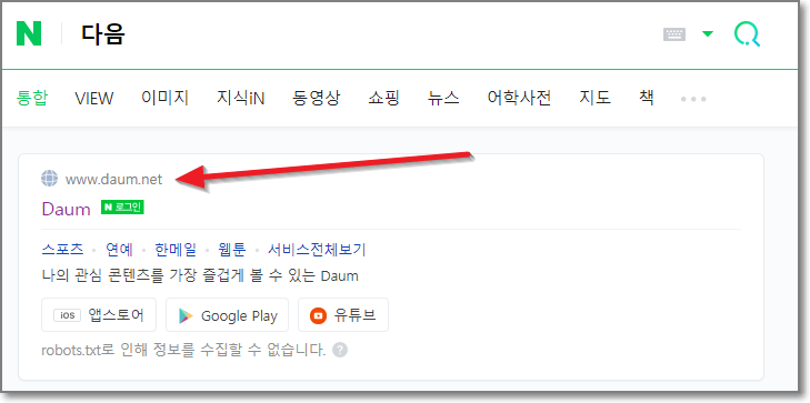 네이버 검색결과 최상단에 "다음"이 나오며 이 Daum을 누르면 다음 홈페이지로 들어가게 됩니다.