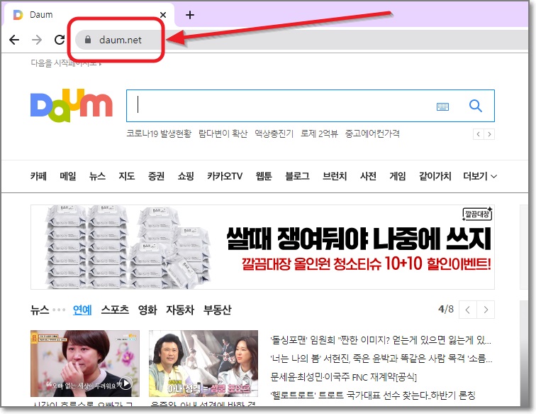 첫 번째로, 인터넷 브라우저 주소창에 daum.net (다음 쩜 넷)이라고 쓰는 방법이 있습니다.