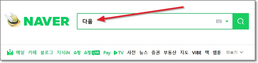 세 번째로, 네이버가 기본 검색엔진으로 되어 있는 경우 네이버 검색창에 "다음"이라고 입력 후 엔터를 치면 됩니다.