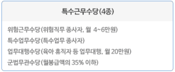 • 위험근무수당(6개 부문별 위험직무 종사자, 월 4~6만 원)