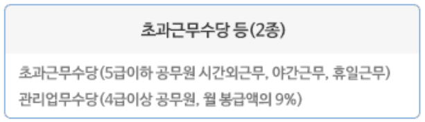 • 초과근무수당(시간 외 근무수당, 야간근무수당, 휴일근무수당)